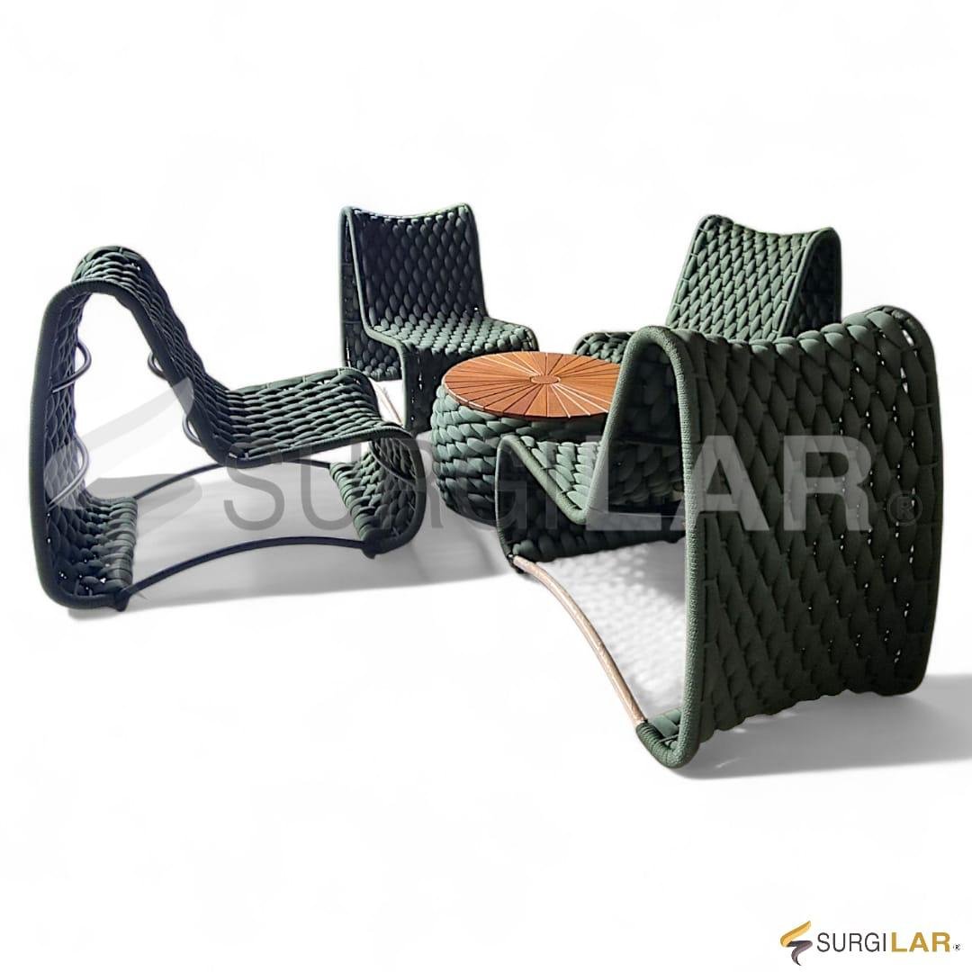 Inspirado em Medellín—Colômbia cercada por montanhas, cores vibrantes e riqueza cultural — este conjunto reúne leveza e personalidade. Produzido em tricô náutico verde, destaca uma trama marcante que remete à natureza exuberante da região. As quatro poltronas oferecem conforto e estilo, enquanto a mesa central com tampa de madeira adiciona praticidade e um toque natural. Um conjunto ideal para criar ambientes acolhedores e cheios da energia inspiradora de Medellín.