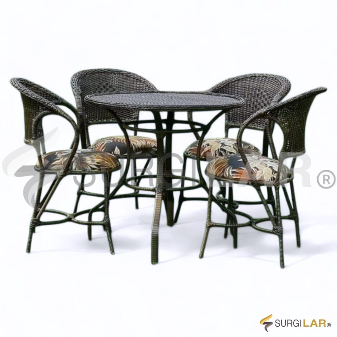 Inspirado em Angra-RJ – destino marcado por águas cristalinas, ilhas encantadoras, clima acolhedor e um equilíbrio natural entre elegância e tranquilidade, este conjunto traz harmonia e leveza ao ambiente. A mesa redonda acompanha quatro cadeiras com anatomia impecável, projetadas para máximo conforto. Produzido em fibra sintética e almofadas estampadas em marrom, oferece um visual sofisticado, resistente e perfeito para compor espaços aconchegantes.